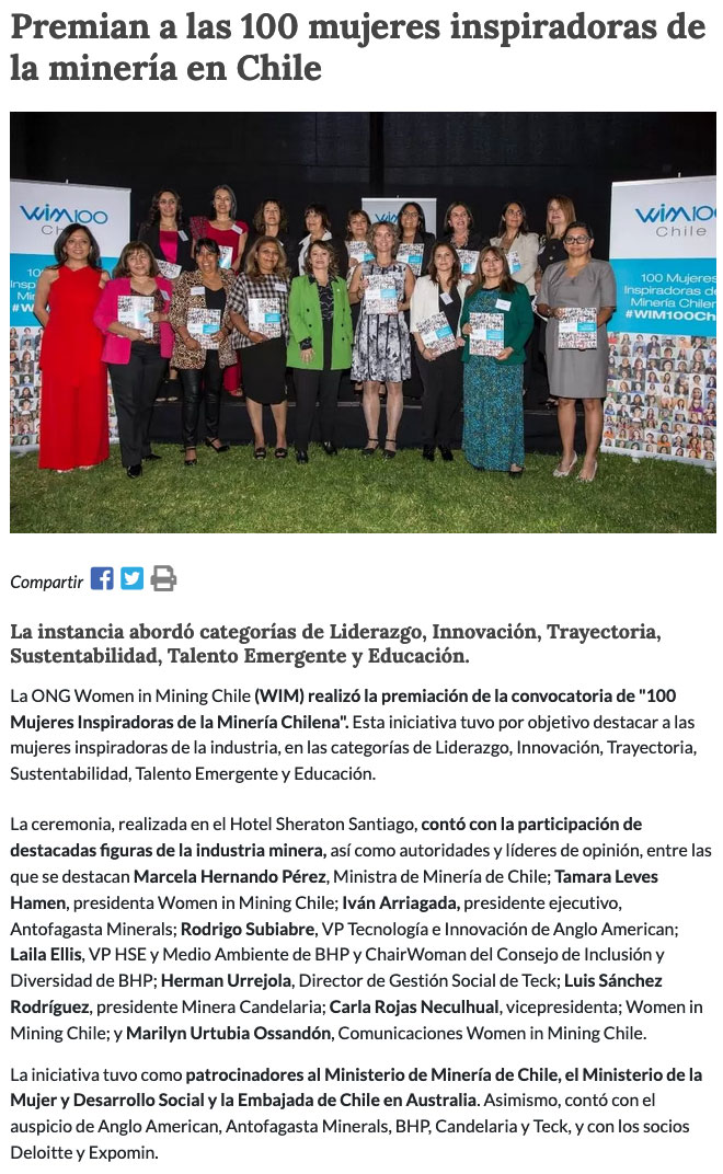 WIM: Marcela Hernando participa en premiación de “100 Mujeres Inspiradoras de la Minería Chilena” - (mch.cl)