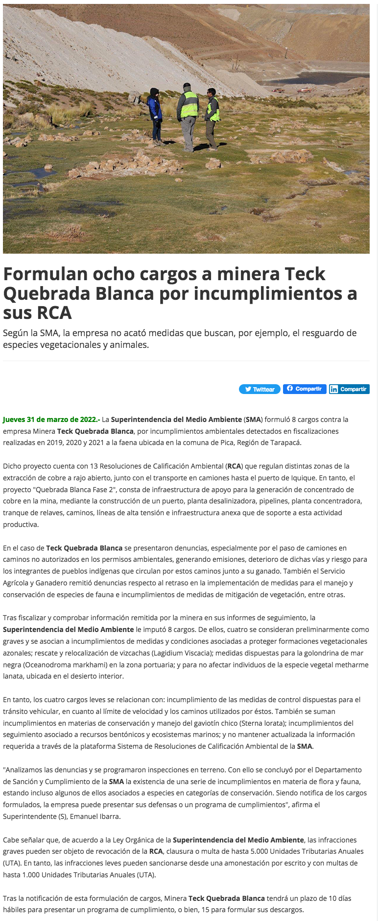 SMA formula cargos a Teck Quebrada Blanca por incumplimientos de medidas para evitar impactos a vegetación y fauna - (mch.cl)