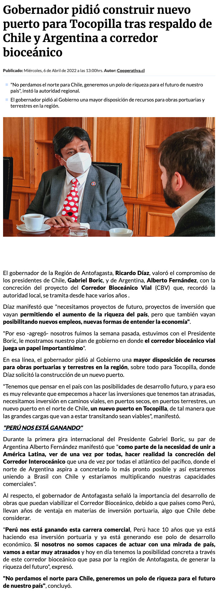 Corredor Bioceánico: Gobernador de Antofagasta solicita nuevo puerto para el norte - (eldesconcierto)