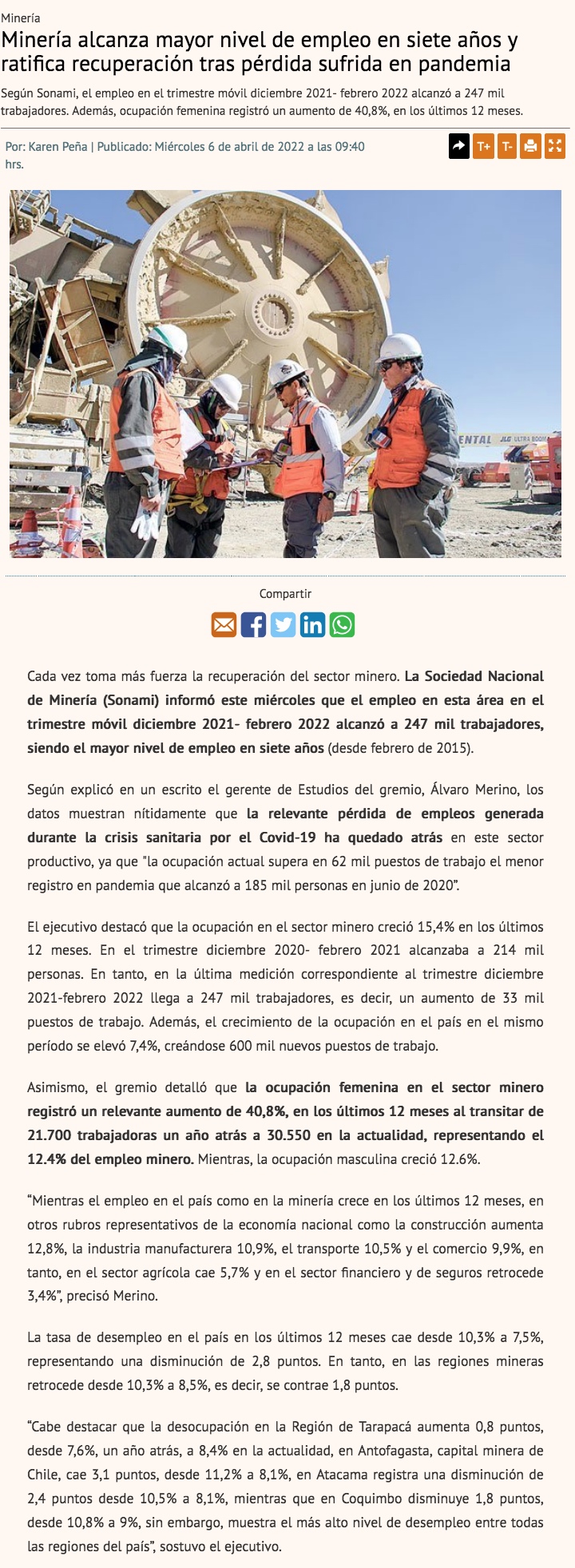 Sonami: Minería alcanza su mayor nivel de empleo en siete años - (mch.cl)