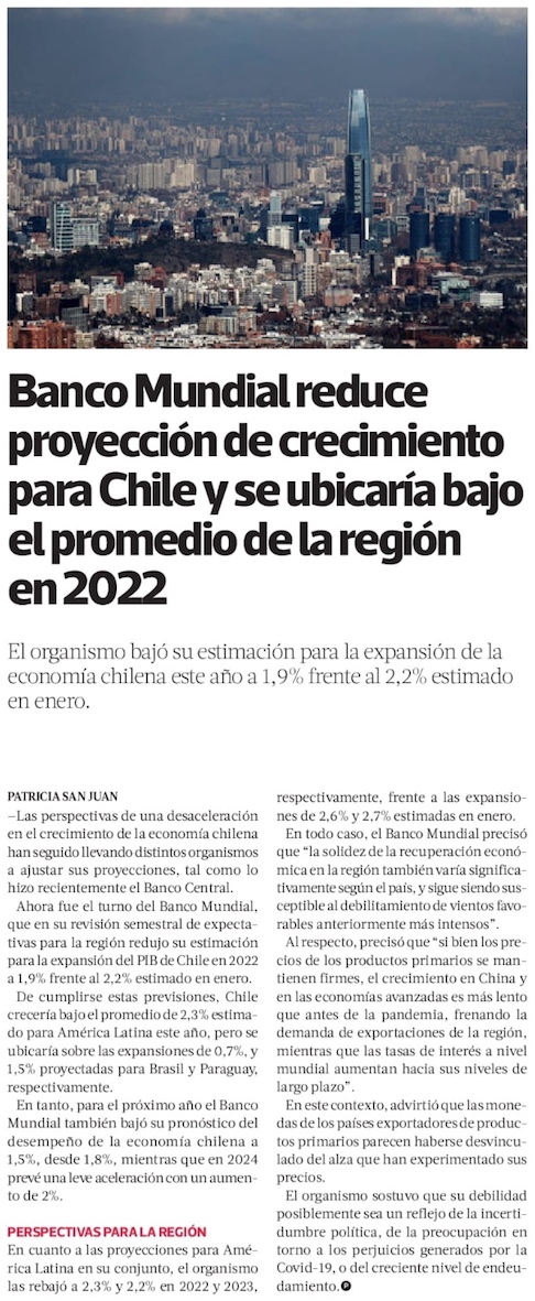 Banco Mundial reduce pronósticos para PIB de Chile en 2022 y 2023, y lo deja bajo el promedio regional - (Diario Financiero)