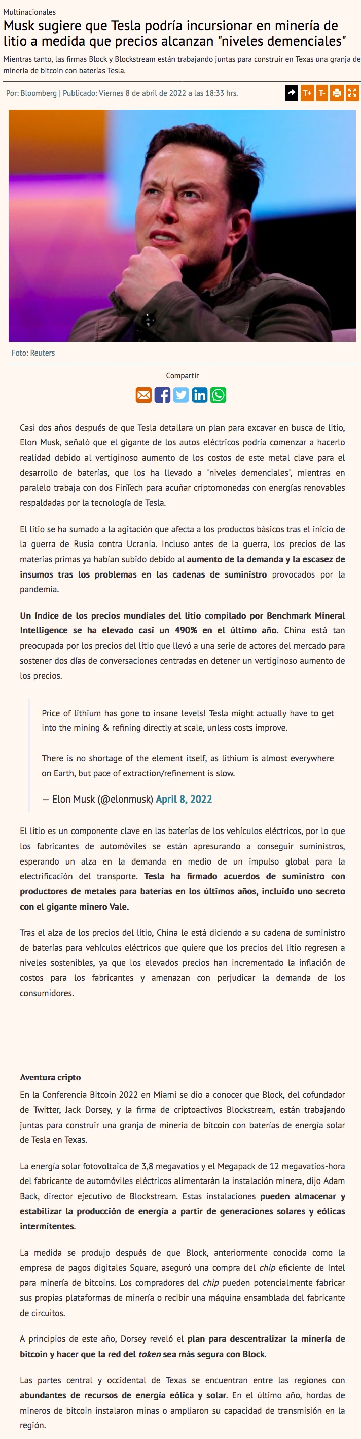 Elon Musk sugiere que Tesla se dedicará a extraer litio si no baja su costo - (El Mostrador)