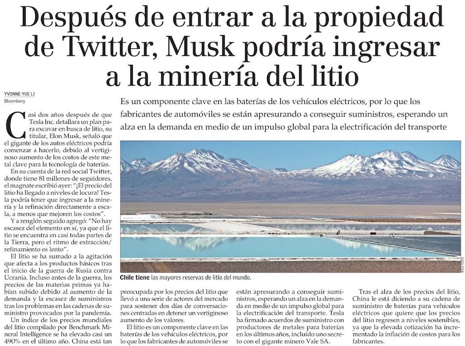 Musk sugiere que Tesla podría incursionar en minería de litio a medida que precios alcanzan “niveles demenciales” - (DF Online)