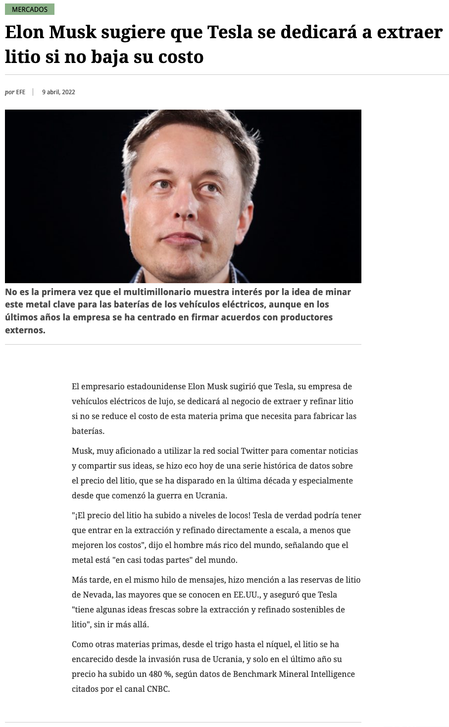 Musk sugiere que Tesla podría incursionar en minería de litio a medida que precios alcanzan “niveles demenciales” - (DF Online)