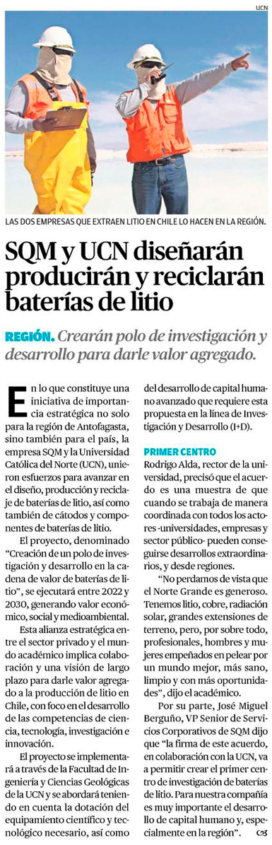 SQM y UCN unen esfuerzos para el diseño, producción y reciclaje de baterías de litio en Antofagasta - (mch.cl)