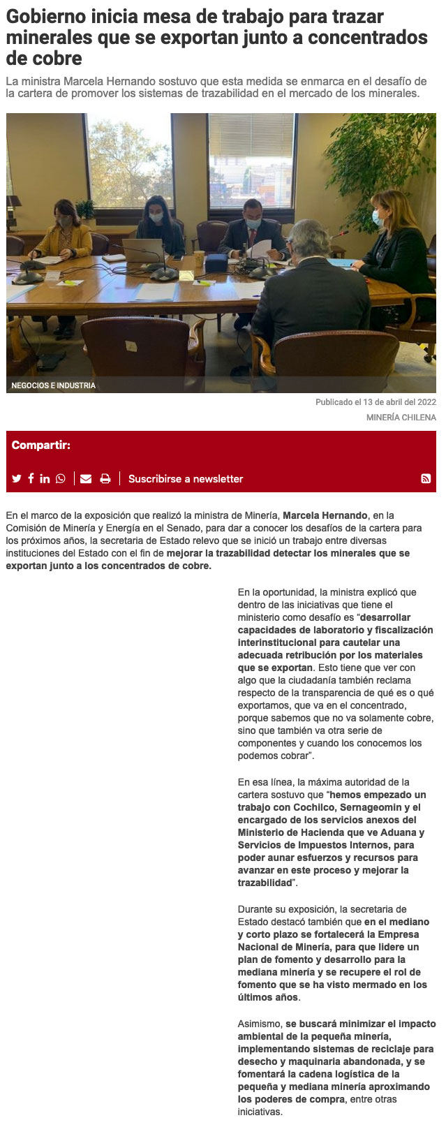 Gobierno inicia mesa de trabajo para trazar minerales que son exportados junto a los concentrados de cobre - (norteminero online)