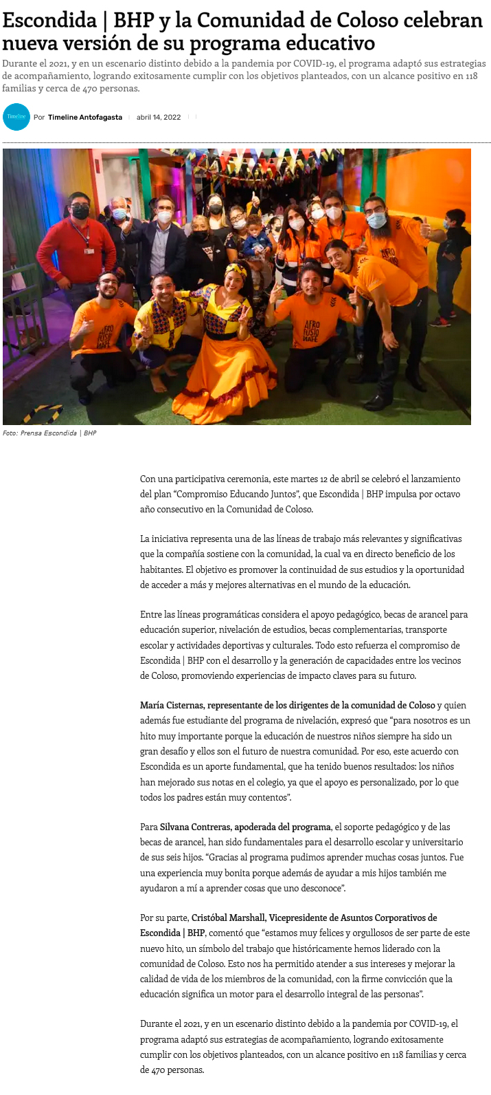 Escondida y comunidad de Coloso celebran nueva versión de programa educativo - (El Mercurio de Antofagasta)