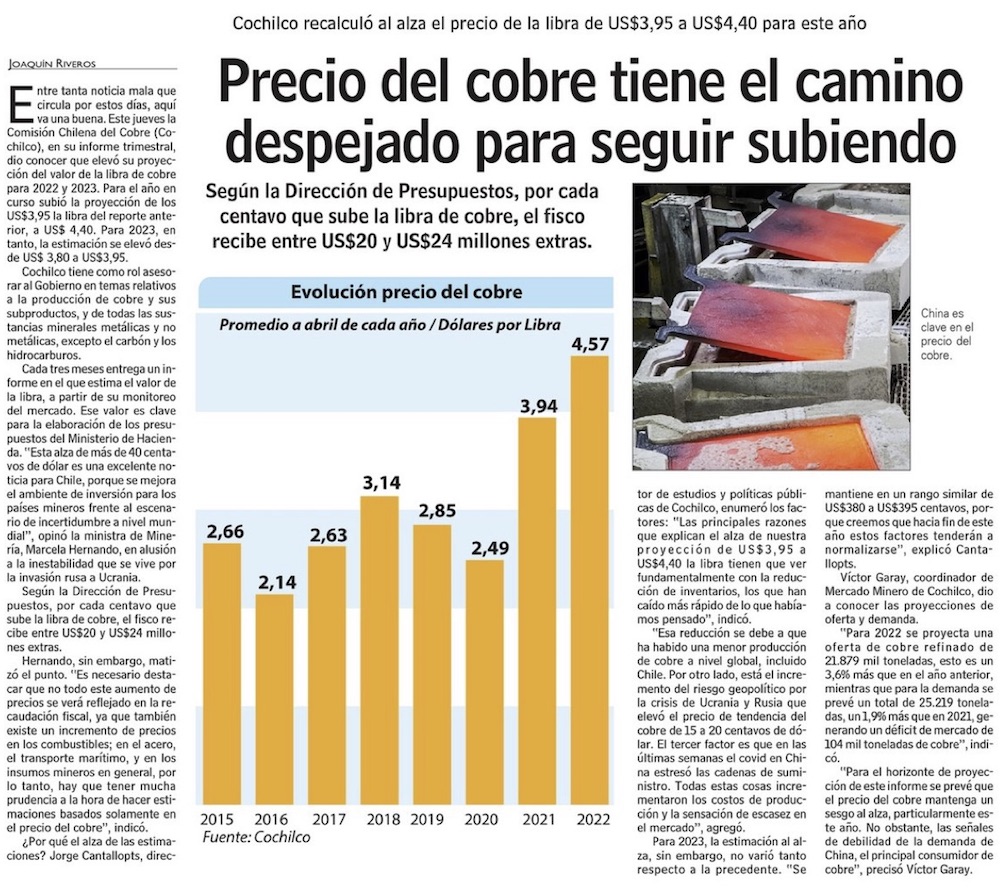 Cochilco eleva proyección del precio del cobre a US$ 4,40 y prevé nuevos record para el 2022 - (El Mercurio de Antofagasta)