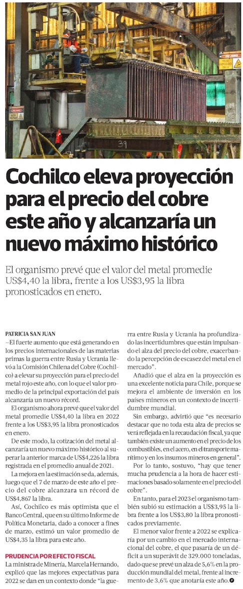 Cochilco eleva con fuerza la proyección del precio promedio del cobre en 2022 por conflicto ruso-ucraniano-ucraniano - (emol)