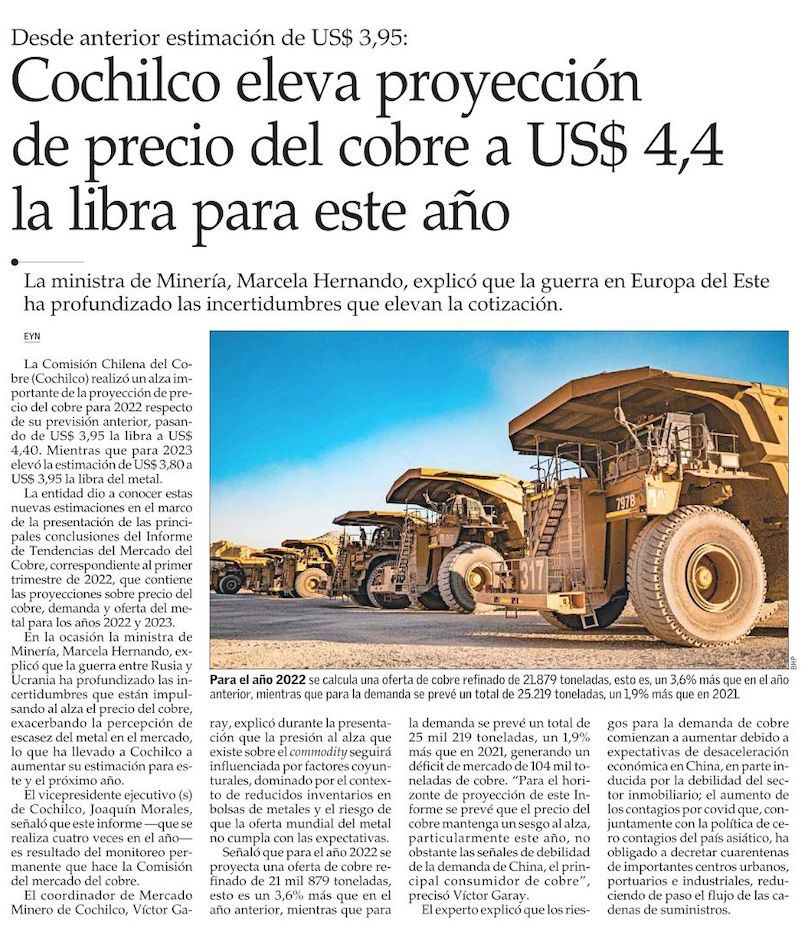 Cochilco eleva proyección del precio del cobre a US$ 4,40 y prevé nuevos record para el 2022 - (El Mercurio de Antofagasta)