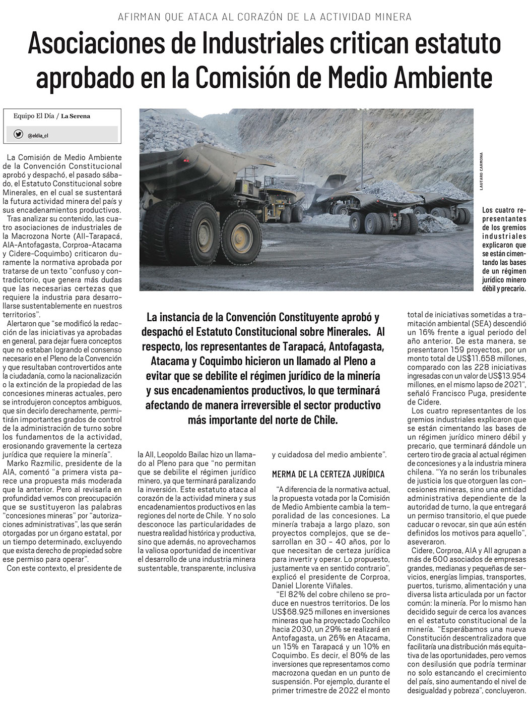 Gremios de la Macrozona Norte: Estatuto aprobado en Comisión de Medio Ambiente ataca al corazón de la actividad minera - (mch.cl)