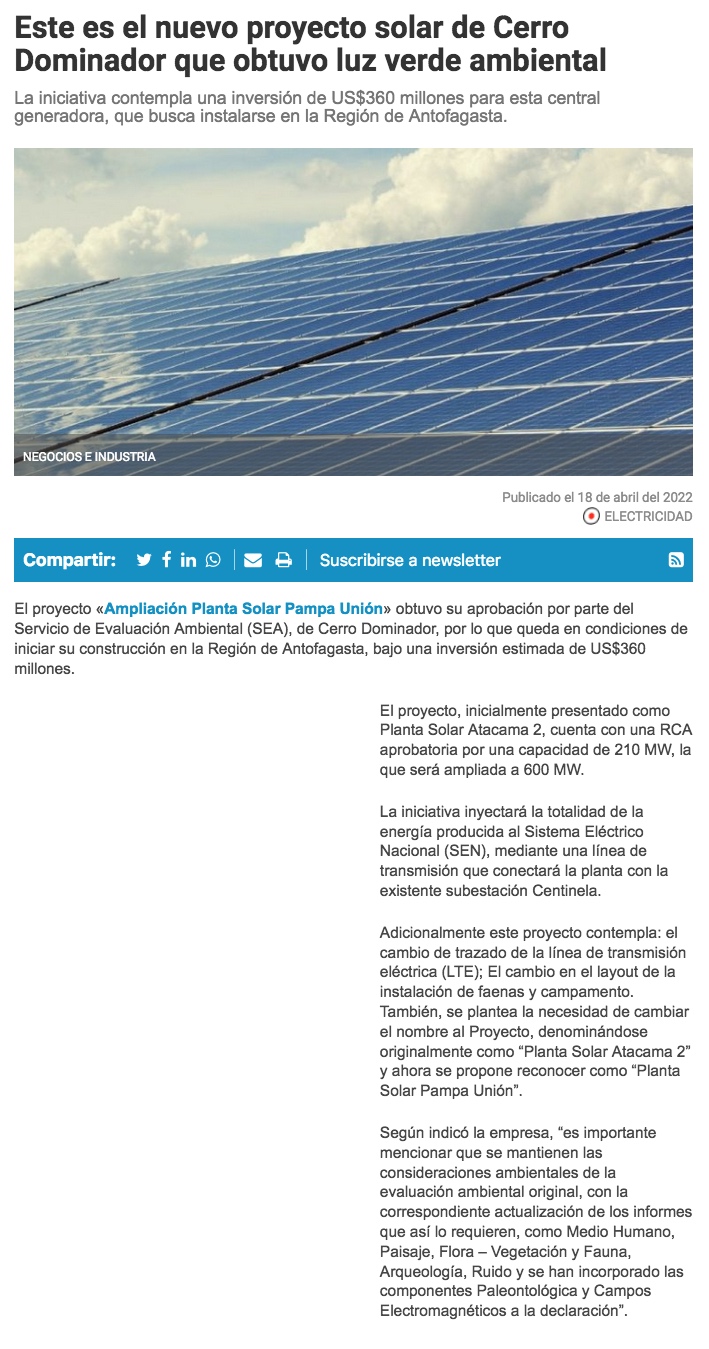 Proyecto fotovoltaico Pampa Unión consigue aprobación ambiental para aumentar capacidad de generación a 600 MW - (portalminero)