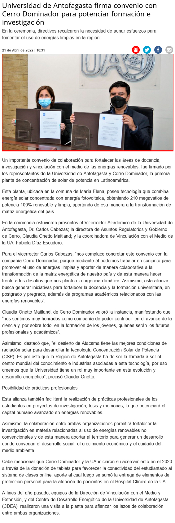 Cerro Dominador y la UA firman alianza para potenciar investigación - (Estrella de Antofagasta)