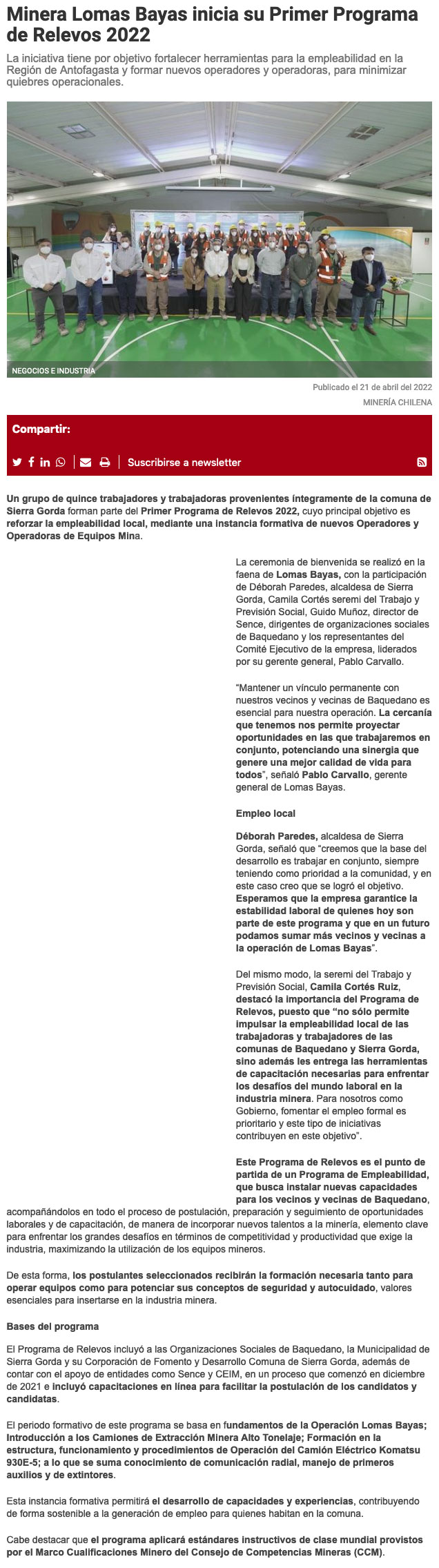 Minera Lomas Bayas inicia su primer Programa de Relevos 2022 - (region2)