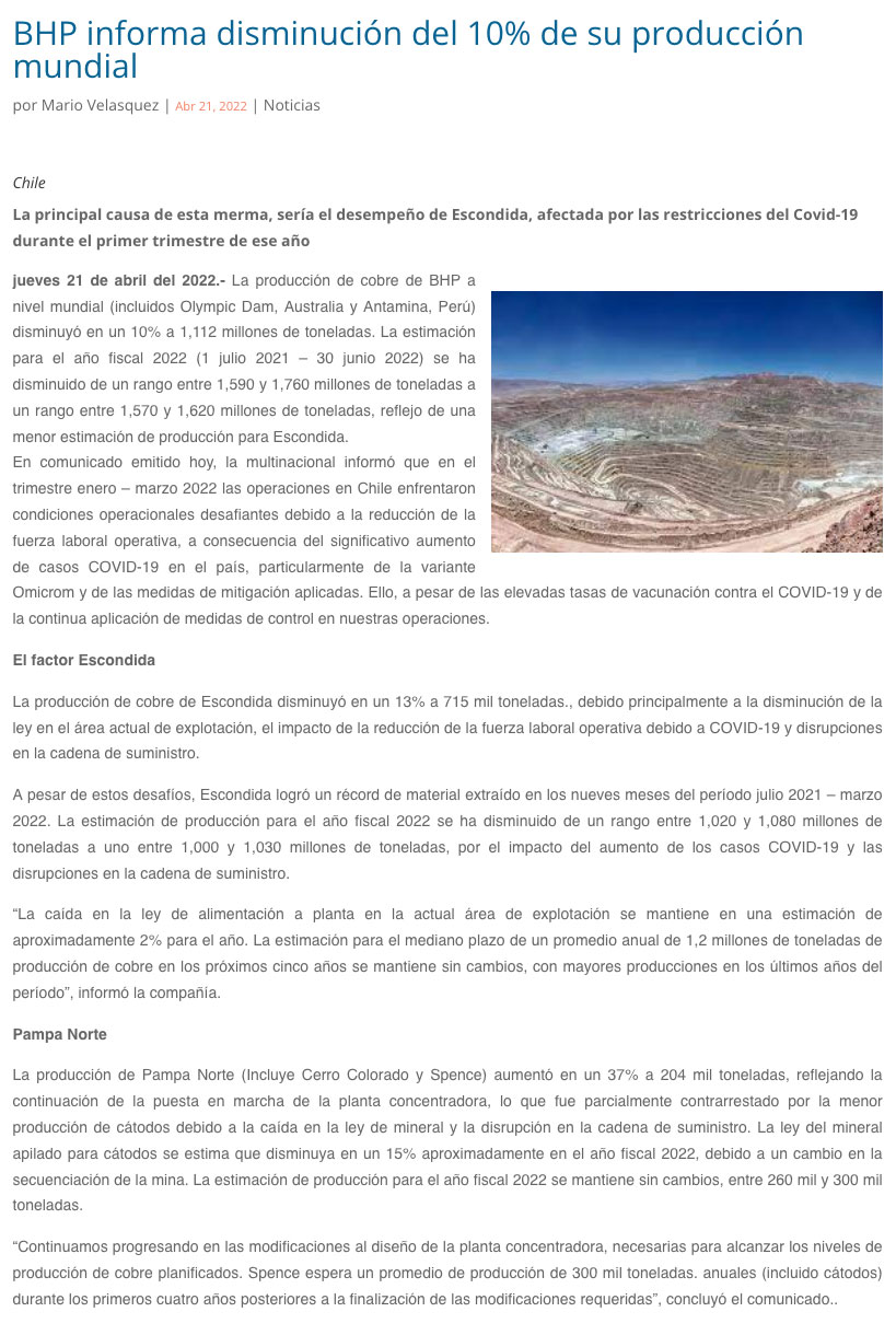 Producción de Minera Escondida presenta una disminución por efectos del Covid-19 - (mch.cl)