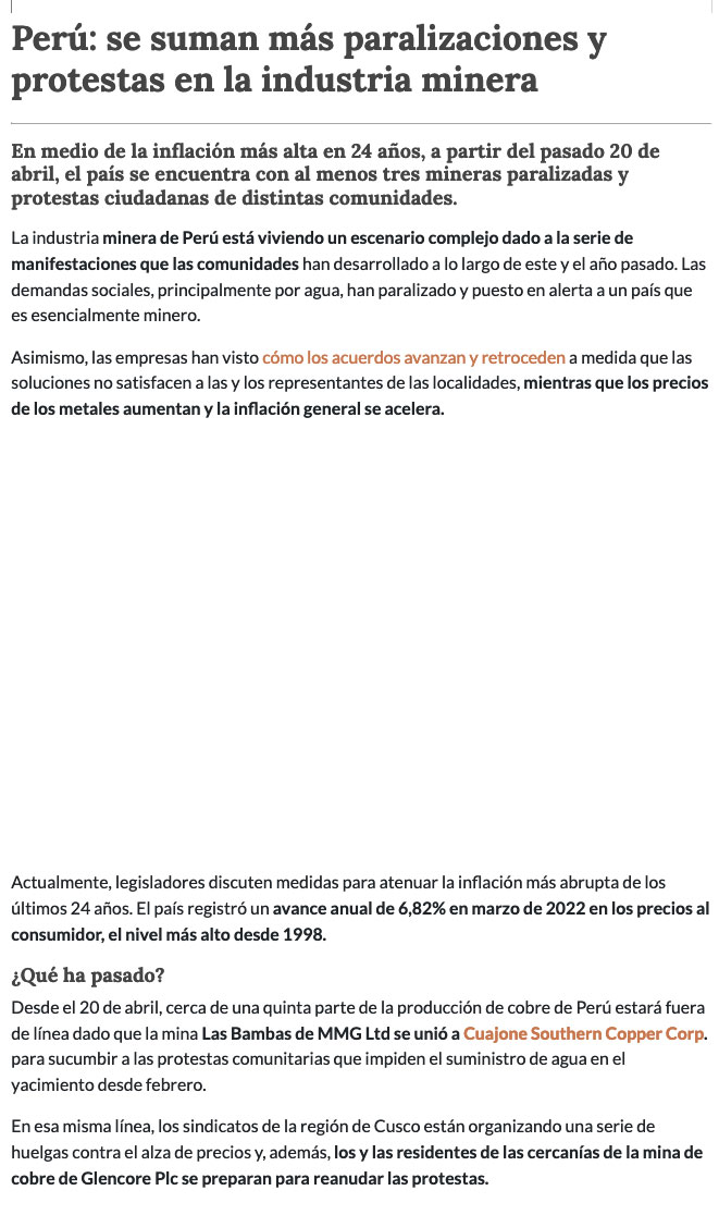 Gobierno peruano declarará estado de emergencia para restaurar producción de cobre en Cuajone - (americaeconomia online)