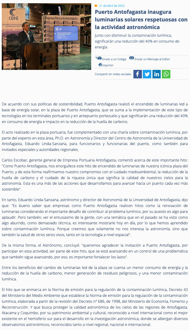 Instalaciones de Puerto Antofagasta cuentan con luminarias solares y respetuosas de los cielos astronómicos - (antofagastanoticias)