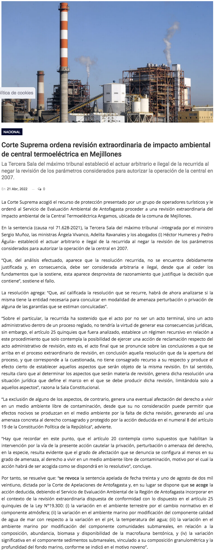 Suprema ordena revisión de impacto ambiental de termoeléctrica en Mejillones - (El Mercurio de Antofagasta)