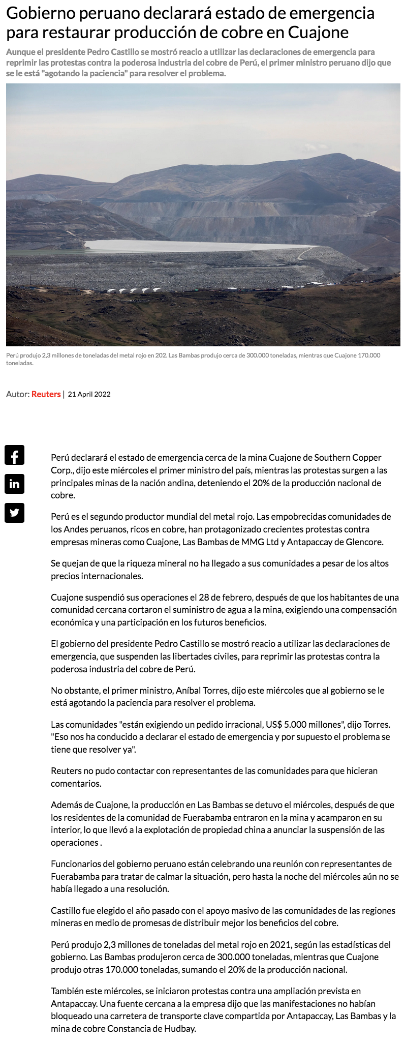 Perú: se suman más paralizaciones y protestas en la industria minera - (reporteminero)