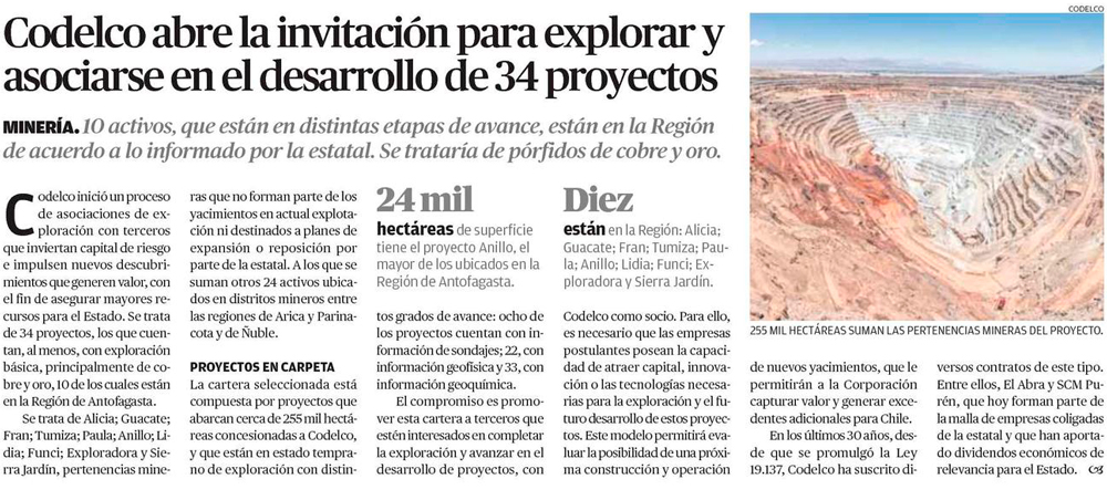 Codelco invita a empresas a explorar 34 proyectos, con opción de asociarse - (El Mercurio de Santiago)