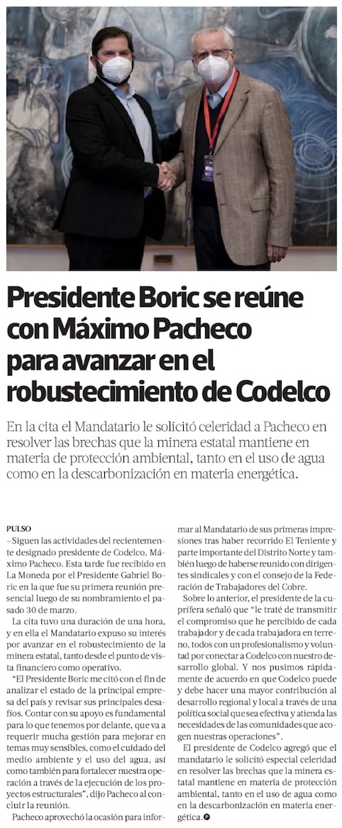 Gabriel Boric se reúne con presidente del directorio de Codelco y manifiesta interés por robustecer la minería - (DF Online)