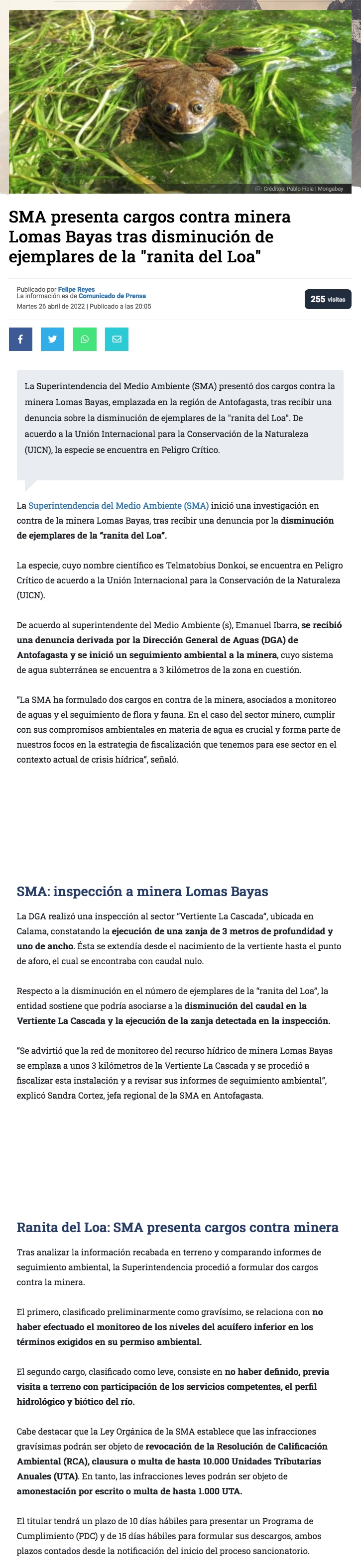 Formulan cargos a Lomas Bayas por acciones que disminuirían ejemplares de ranita del Loa - (El Mercurio de Calama)