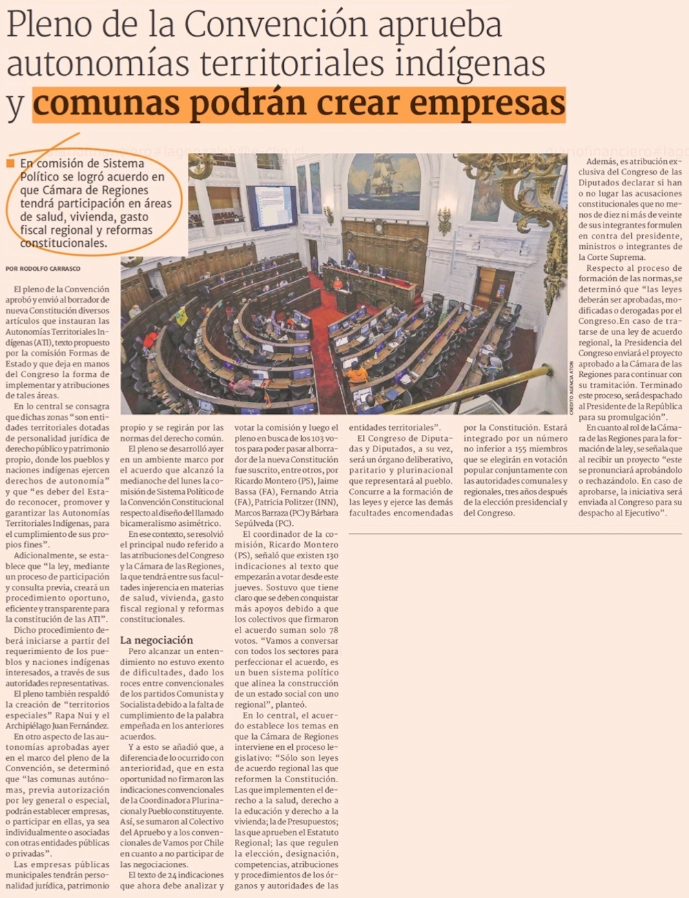 Convención aprueba norma para que Chile tenga "autonomías territoriales indígenas" - (La Tercera)