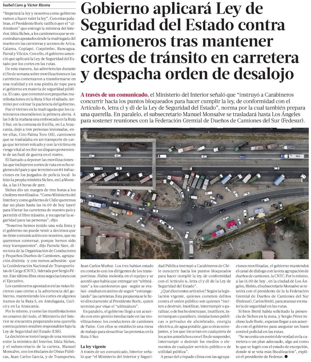 Camioneros deponen mayoría de bloqueos durante la noche sin responder a ultimátum del Gobierno de aplicar la Ley de Seguridad - (El Mercurio de Santiago)
