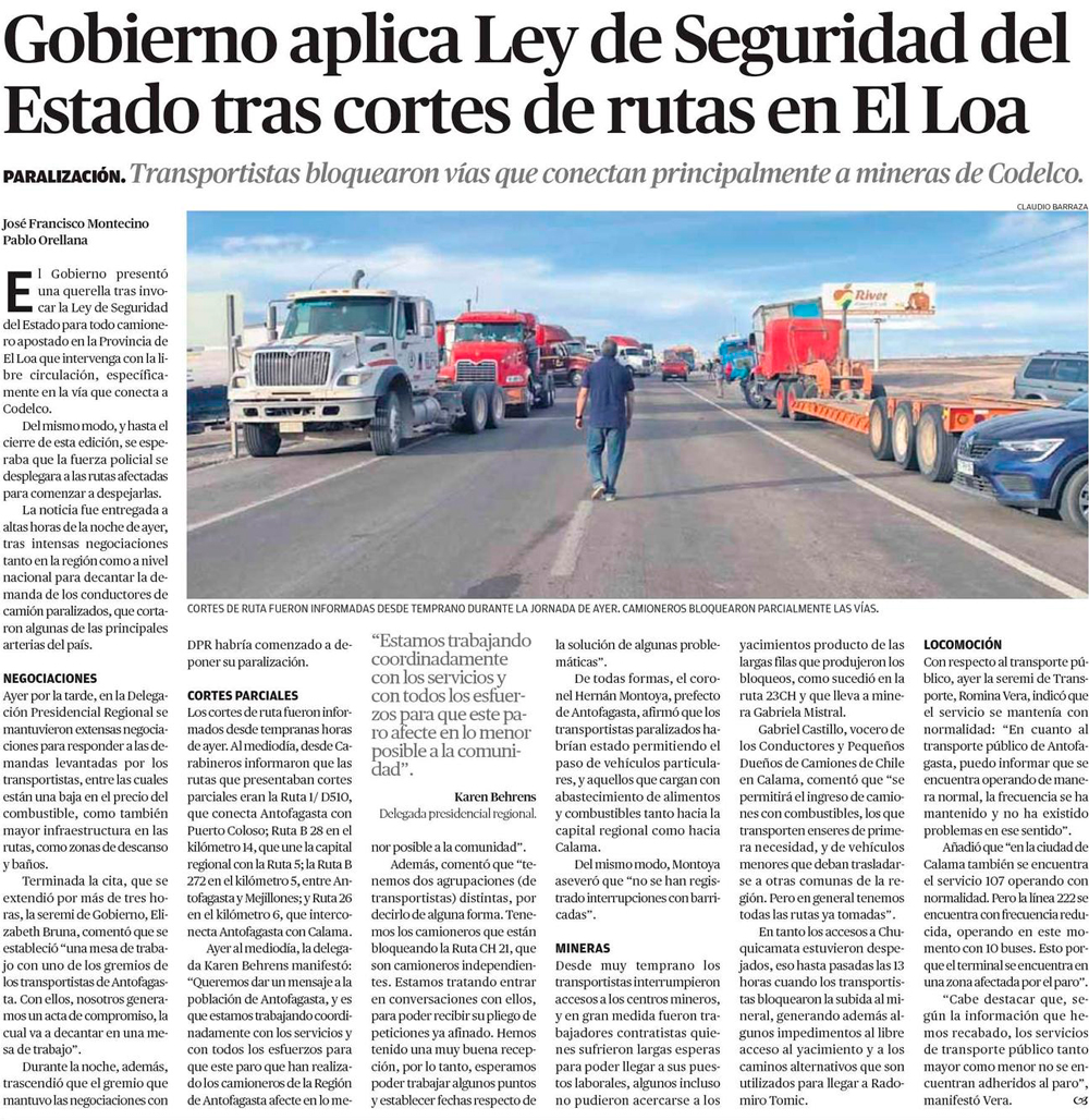 Camioneros deponen mayoría de bloqueos durante la noche sin responder a ultimátum del Gobierno de aplicar la Ley de Seguridad - (El Mercurio de Santiago)