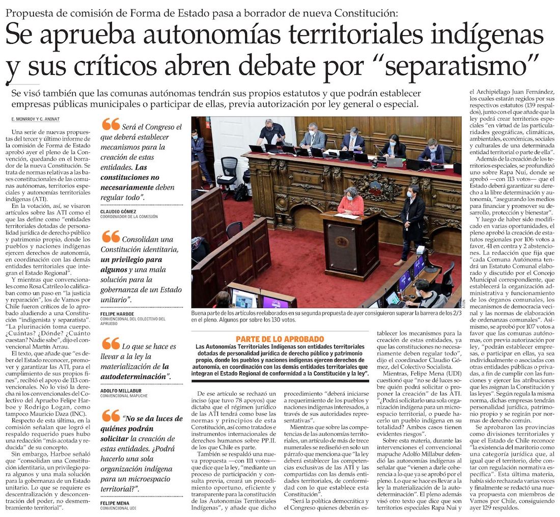Convención aprueba norma para que Chile tenga "autonomías territoriales indígenas" - (La Tercera)