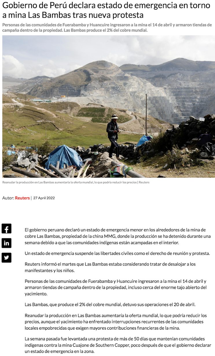 Perú declara en emergencia la zona de la mina Las Bambas - (El Mercurio de Santiago)