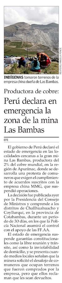 Gobierno de Perú declara estado de emergencia en torno a mina Las Bambas tras nueva protesta - (americaeconomia online)