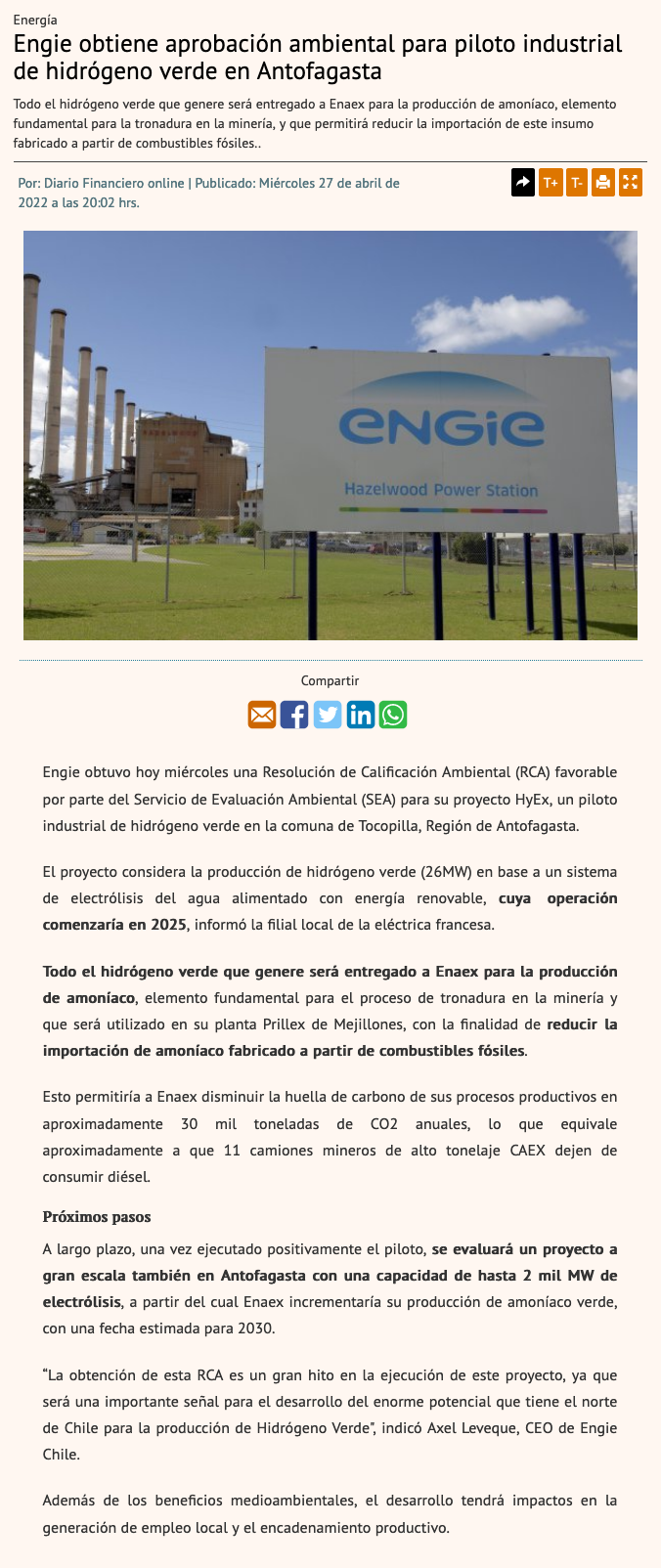 Hidrógeno verde: Proyecto de Engie y Enaex obtuvo su aprobación ambiental - (mch.cl)
