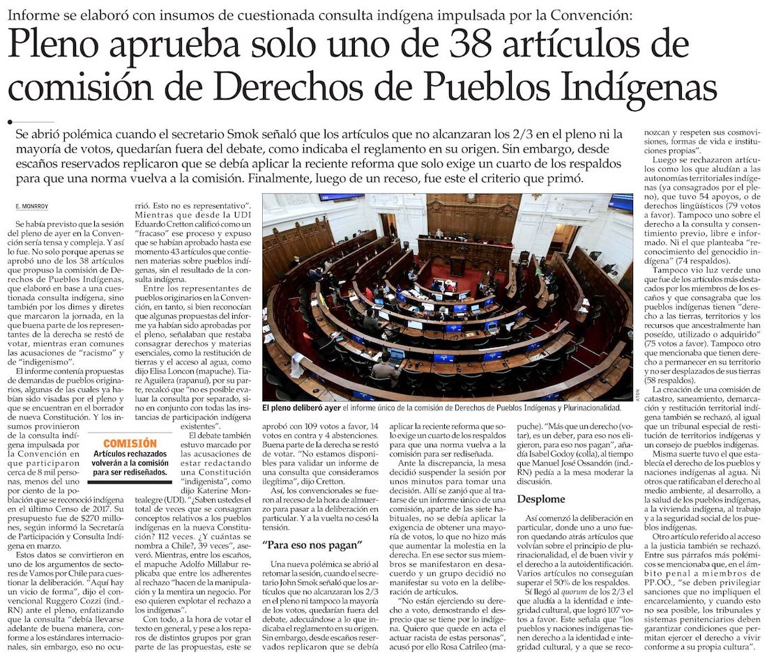 Consulta indígena: pleno aprueba solo un artículo - (La Tercera)