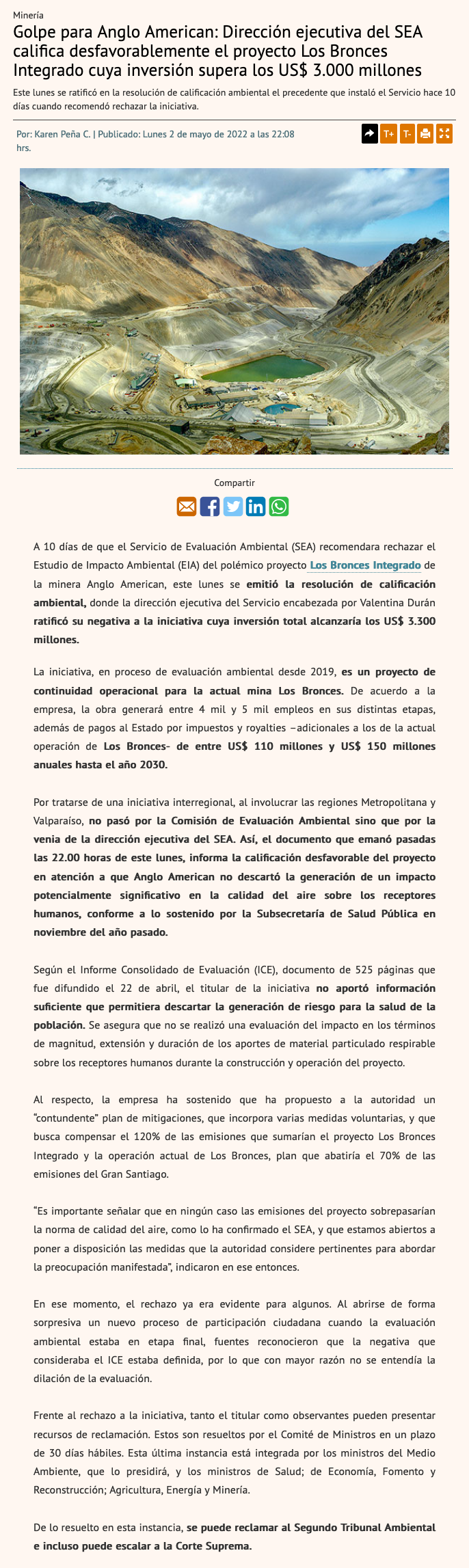 Autoridad ambiental rechaza megaproyecto de Anglo American cuya inversión supera los US$3.000 millones - (Pulso)