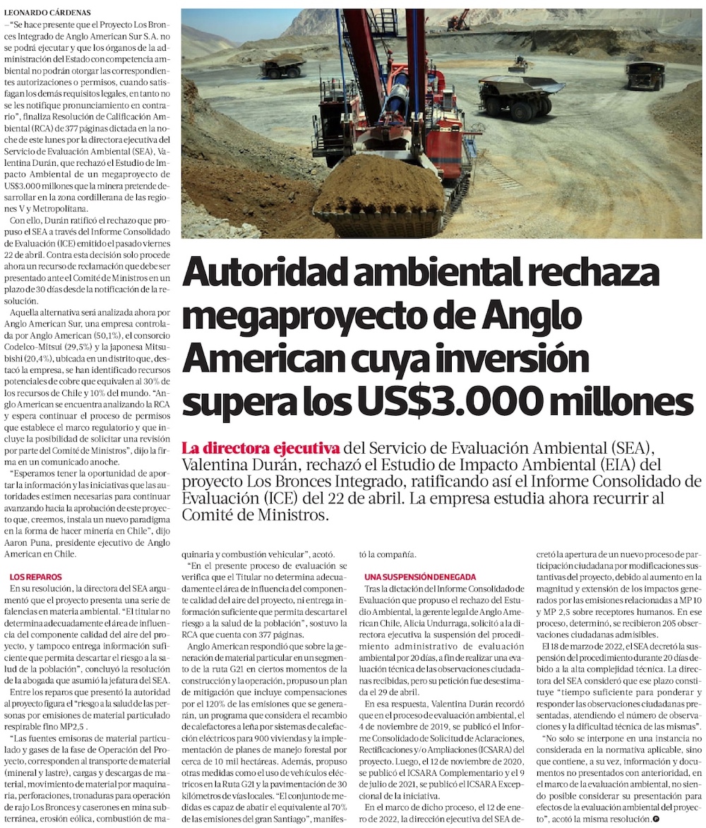 Golpe para Anglo American: Dirección ejecutiva del SEA califica desfavorablemente el proyecto Los Bronces Integrado cuya inversión supera los US$ 3.000 millones - (DF Online)