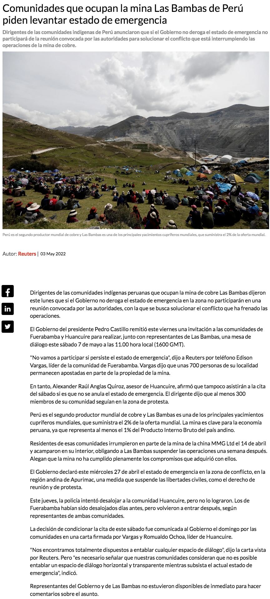 Comunidades de Las Bambas de Perú piden levantar estado de emergencia para dialogar - (Diario Financiero)