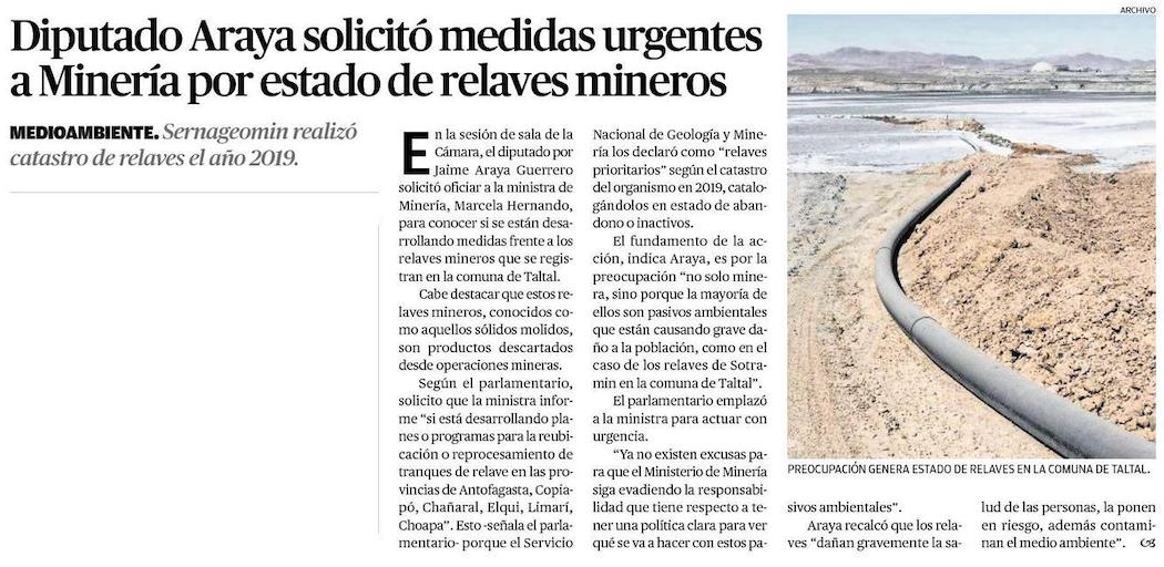 Diputado Jaime Araya solicita medidas urgentes por relaves en Taltal - (termometro.cl)