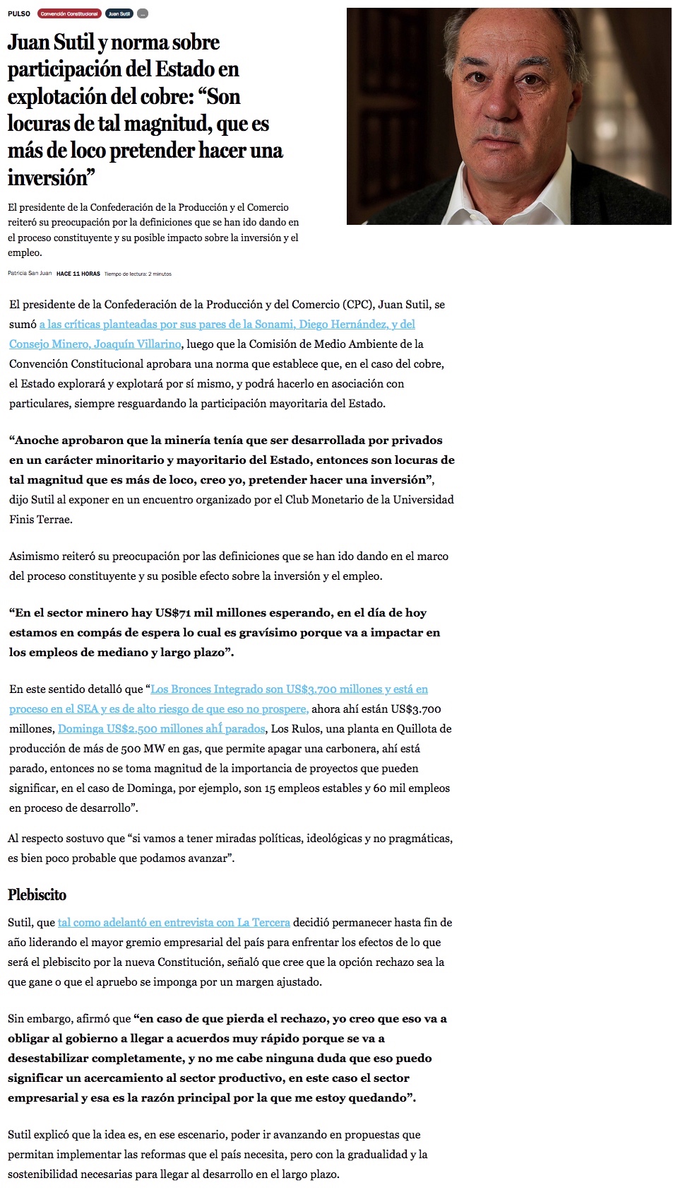 Juan Sutil y norma sobre participación del estado en explotación del cobre: “Son locuras de tal magnitud, que es más de loco pretender hacer una inversión” - (chilemineria.cl)