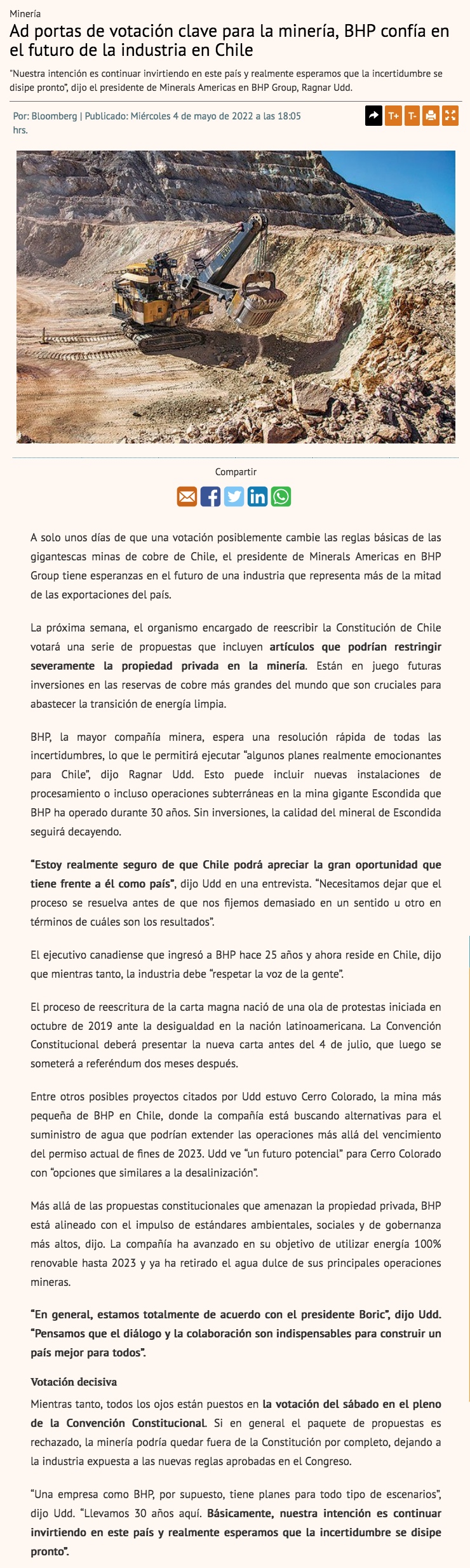 Antes de votación clave en la Convención, BHP confía en el futuro minero de Chile - (bloomberglinea.com)