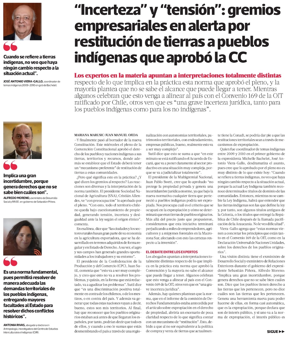 Gremios ven incertidumbre jurídica por derecho de reparación de tierras a pueblos indígenas - (El Mercurio de Santiago)