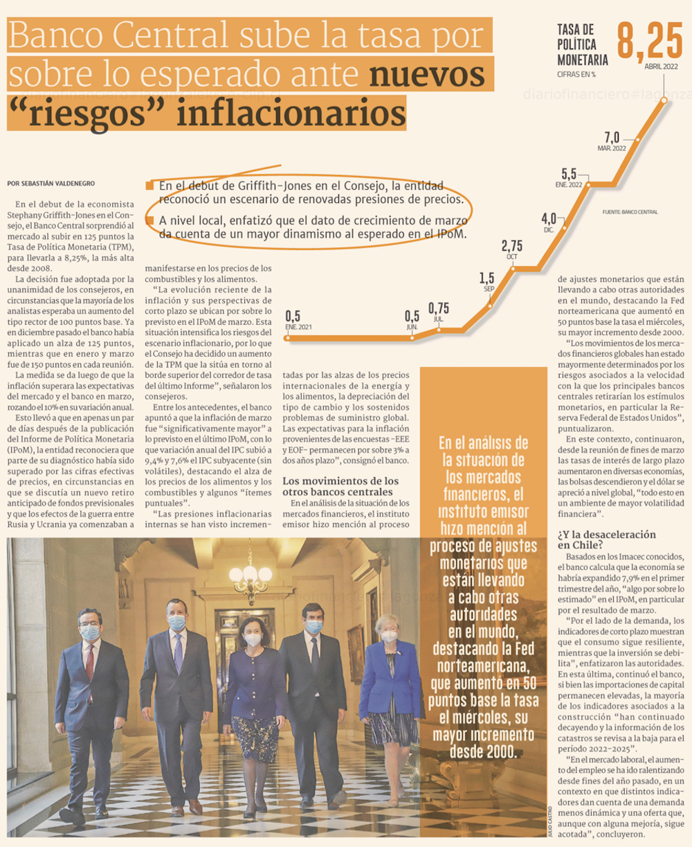 BC sorprende al subir la tasa a 8,25%, su mayor nivel desde 2008, por inflación sobre lo previsto - (El Mercurio de Santiago)