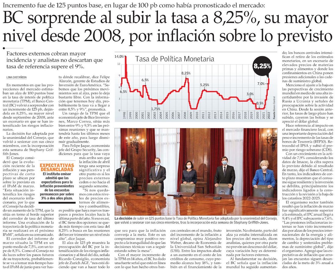 Banco Central sube la tasa más de lo esperado ante nuevos riesgos inflacionarios - (Diario Financiero)