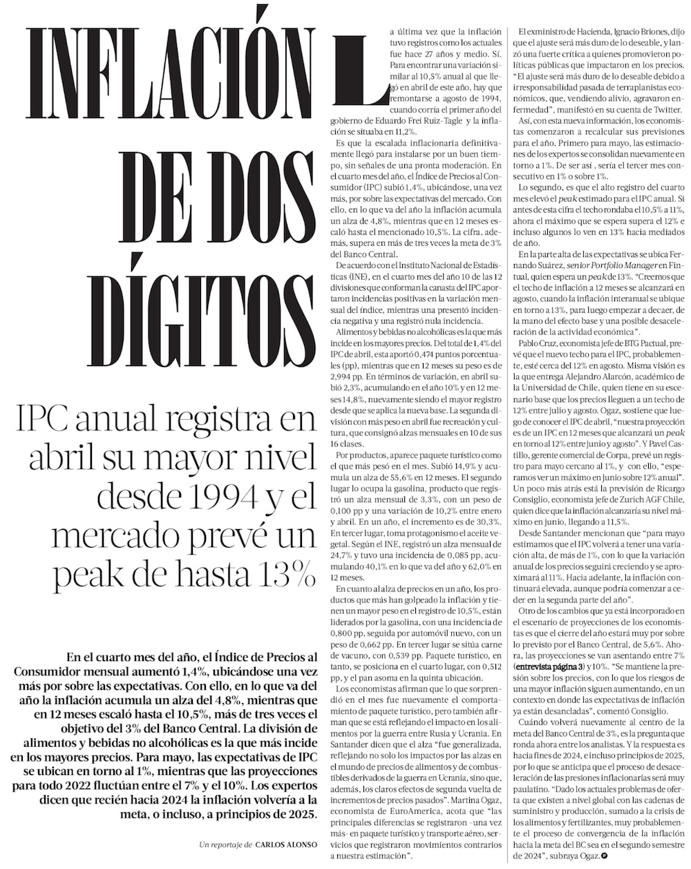 Inflación anual sube a 10,5%, la más alta en 28 años, y pone presión a tasas y deudas en UF - (El Mercurio de Santiago)