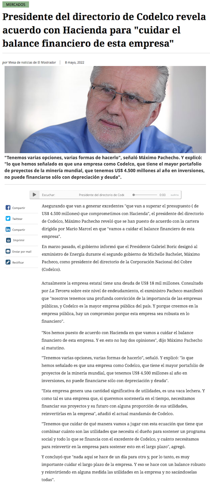 Máximo Pacheco: “Nos hemos puesto de acuerdo con Hacienda en que vamos a cuidar el balance financiero de Codelco” - (Pulso)
