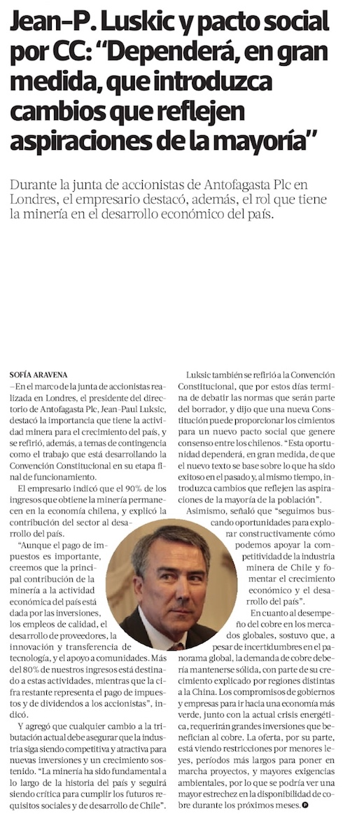J-P Luksic pide que royalty minero mantenga competitividad del sector - (El Mercurio de Santiago)