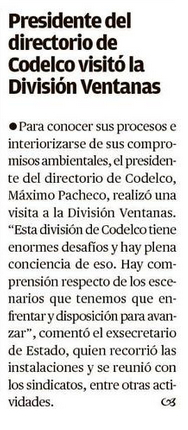 Pacheco a trabajadores de Codelco: “Hoy tenemos la oportunidad de renovar y fortalecer la alianza estratégica” - (Diario Financiero)