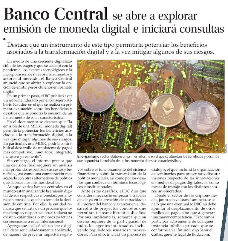 Banco Central publica primer informe de evaluación para la emisión de una nueva moneda digital en Chile - (Diario Financiero)