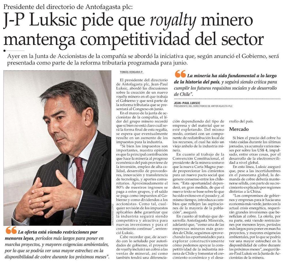 Luksic y el pacto social: “Dependerá de que refleje aspiraciones de la mayoría” - (Diario Financiero)