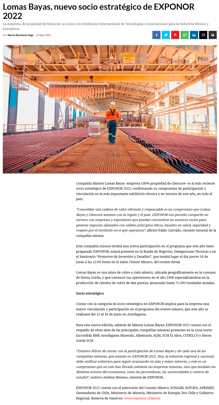 Lomas Bayas nuevo socio estratégico de Exponor 2022 - (nuevaminería online)